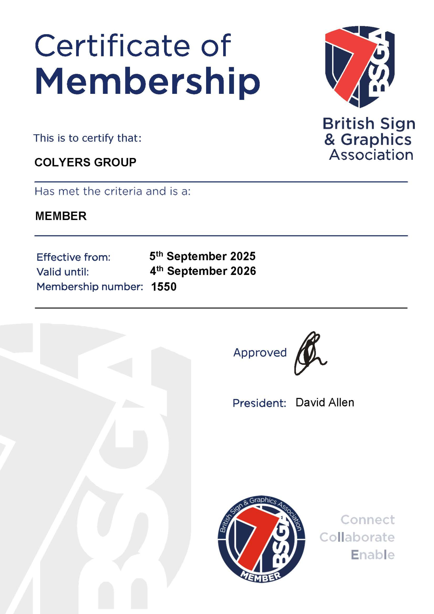 We’re delighted to announce that Colyer, as part of the GDL Group, has officially joined the British Sign & Graphics Association (BSGA) — a respected organisation dedicated to supporting and promoting excellence within the UK sign, graphics, and visual communications industry.